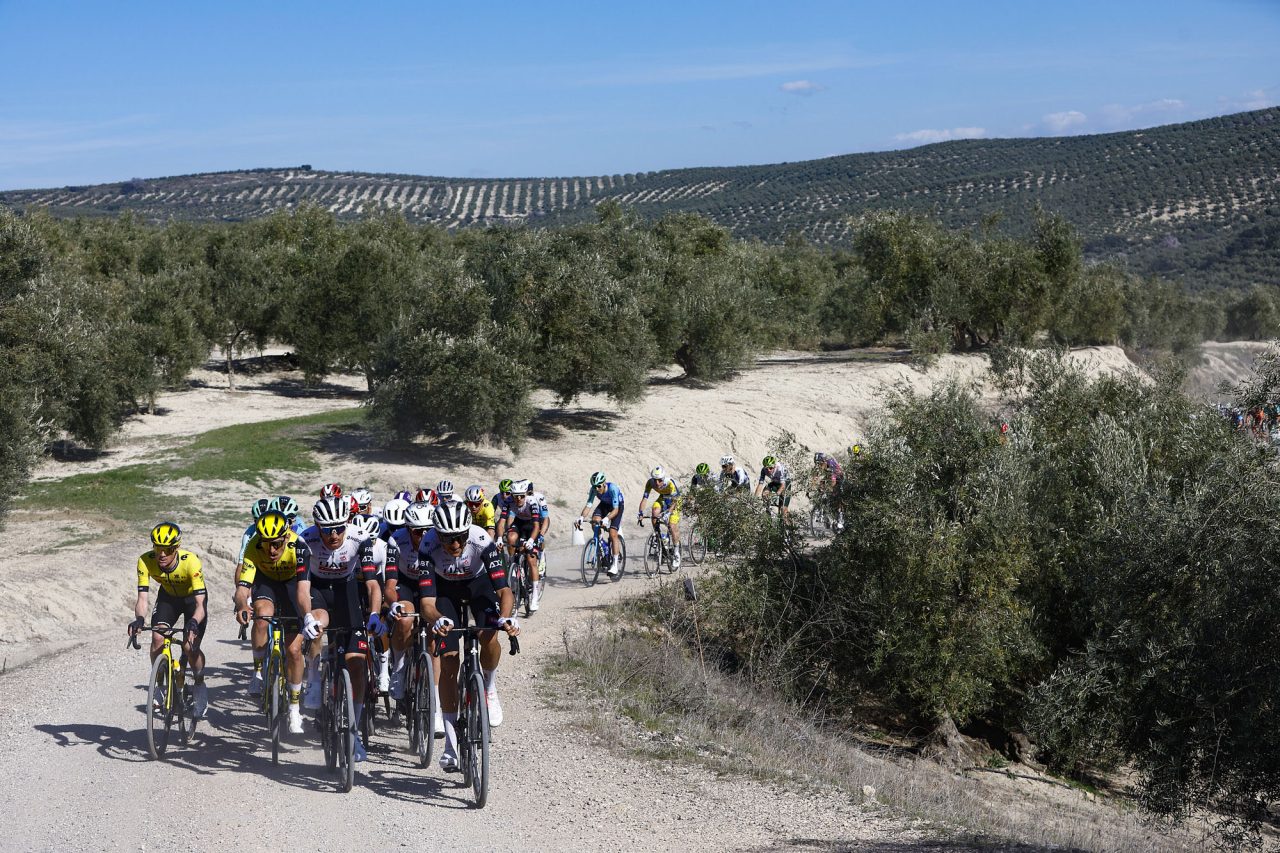 Pelotón entre olivos durante la Clásica Jaén Paraíso Interior 2025.